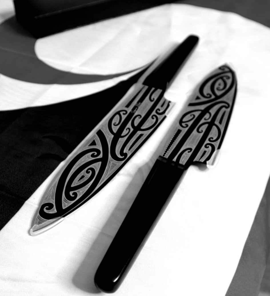I am honoured to have worked with one of Aotearoa's hottest Tā moko designers - MJC Tā Moko & Designs. MJC’s talented hands have been able to bring to surface the rich history of Maraeroa; my place of home, the name which my daughter carries and now, these blades.