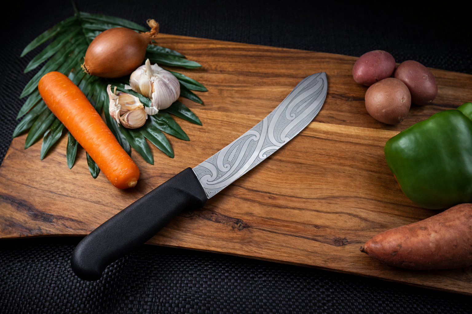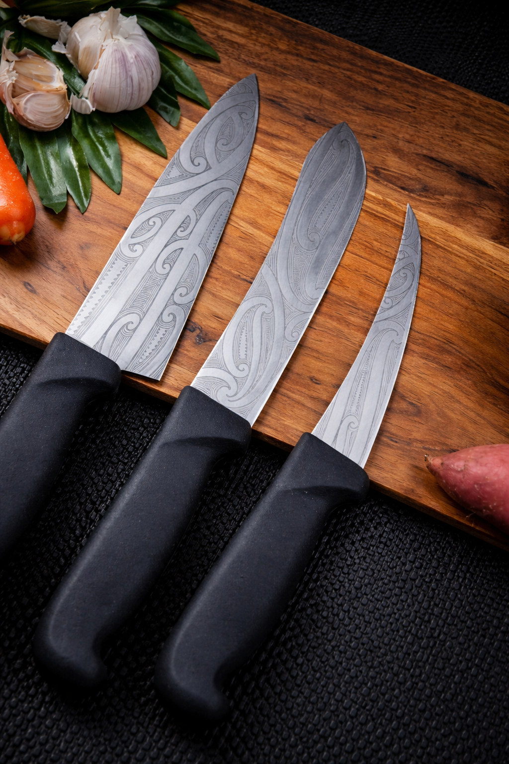Professional stainless-steel blades with unique, intricate Indigenous Māori detailing; double lasered (silver etched) all over the blade's surfaces. These butcher-friendly knives have sturdy, food-safe handles that are made of fresh PP + TPR.